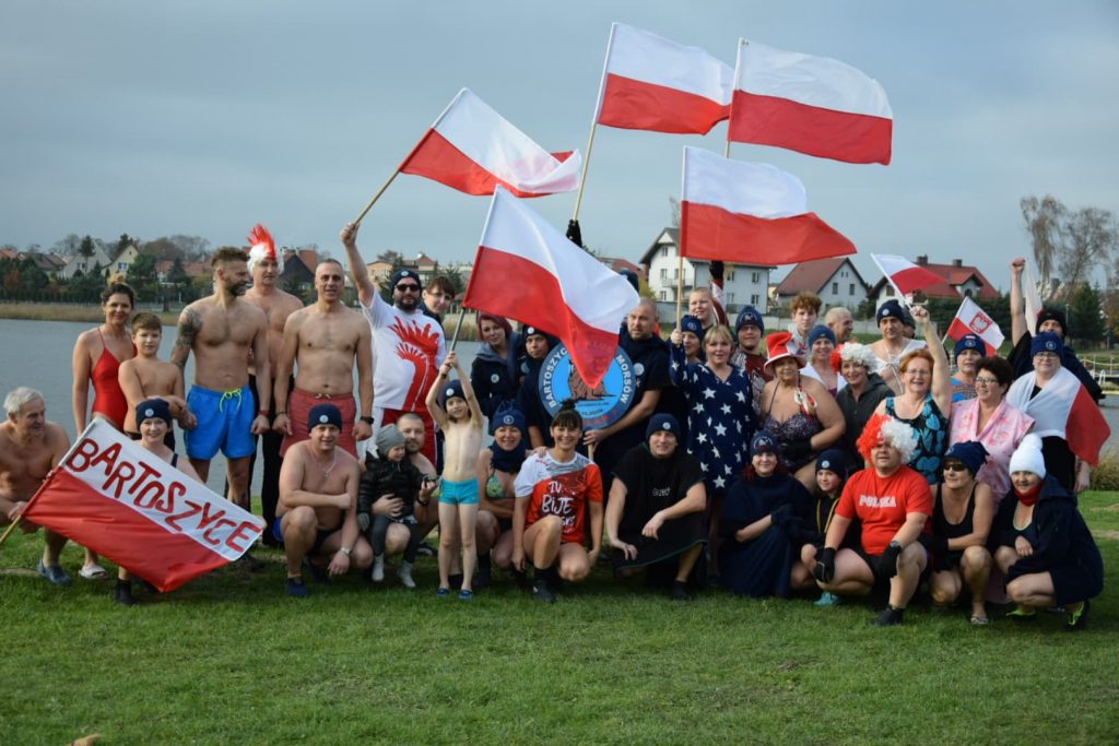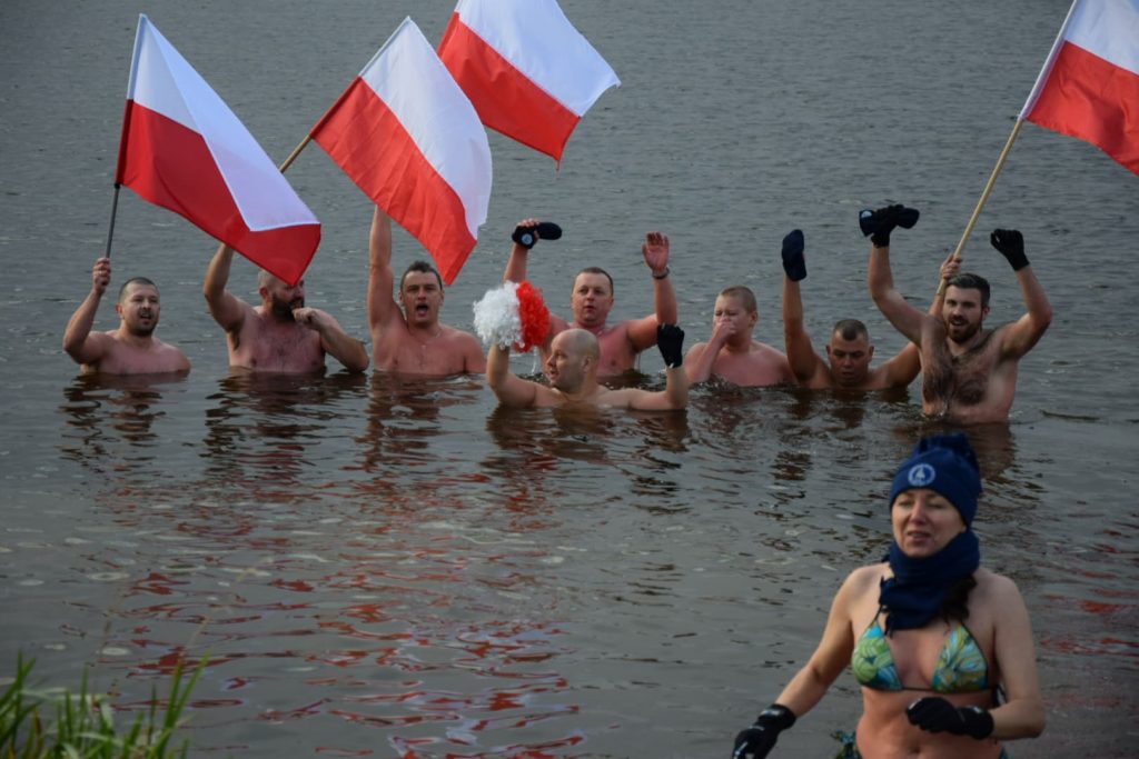 Każda kąpiel morsów w jeziorku miejskim to ogrom radości, ale dziś potęguje ją wyjątkowa rocznica, bo dotycząca Dnia Niepodległości. Stąd nie tylko endorfiny na skutek skorzystania z zimnej kąpieli, ale również z możliwości świętowania również w ten sposób z dumnie uniesionymi flagami.